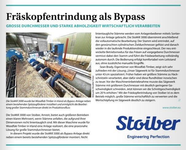 The Schwärzler sawmill presents the new milling head debarking machine with root reducer from Stoiber Maschinenbau. From now on, logs up to a diameter of 120 cm can be debarked. For more information, see the report in the Holzkurier.